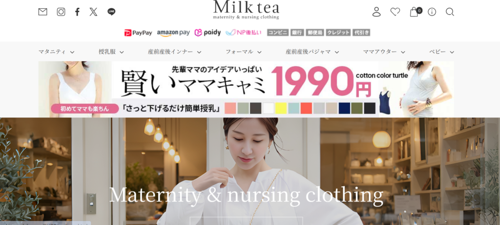 ミルクティーは、妊娠中から産後まで長く使える設計が魅力の人気ブランドです。特に「一見マタニティ服に見えないデザイン性の高さ」が特徴で、普段着としても違和感なく着用できます。