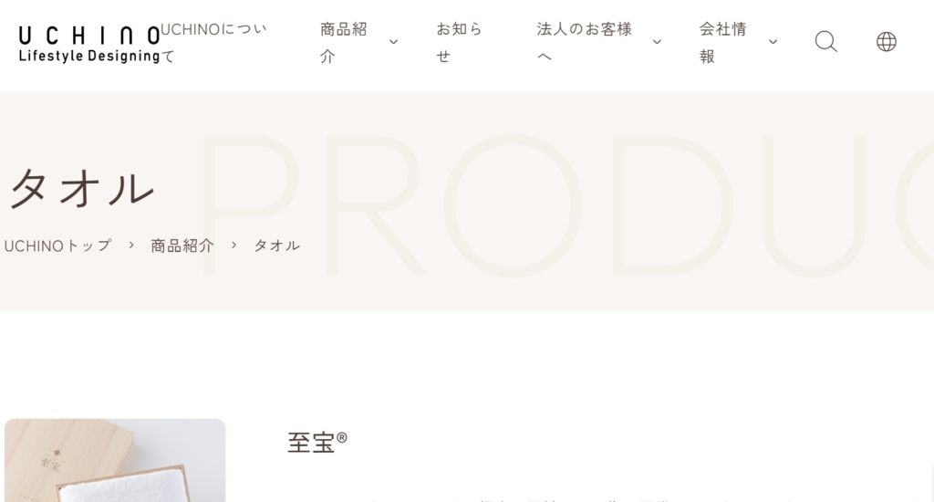 UCHINOは百貨店などでも取り扱いが多い高級タオルブランドです。マシュマロガーゼなどの独自素材が人気で、柔らかい肌触りが特徴です。